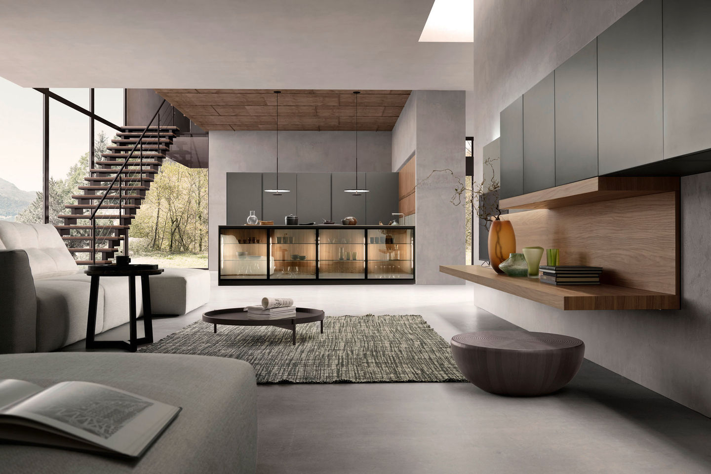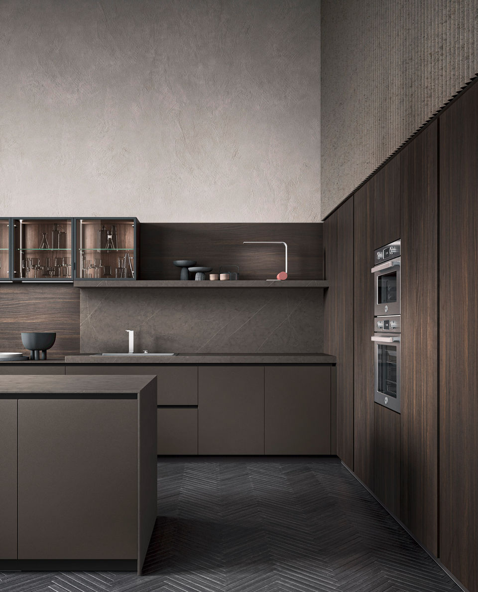 The Moka collection is available in different materials: thermostructured, HPL and Fenix laminate, stoneware, glass, veneered and in glossy, matt, microtextured, polisoft and metal lacquers. The expertly studied colors create continuity between the kitchen and the surrounding environments, giving a sense of natural elegance.
